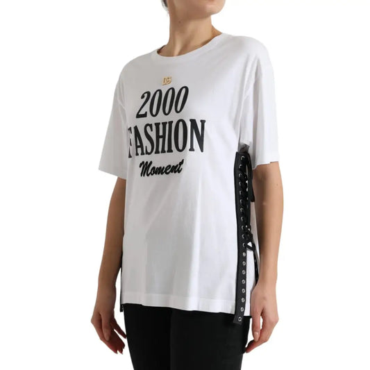Dolce & Gabbana White Slogan Print Lacing Detailed T-shirt