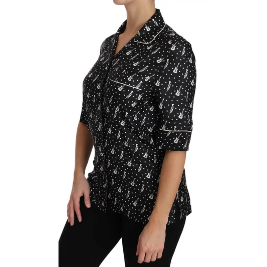 Dolce & Gabbana Black GuitarTrumpet Print Silk Shirt Top