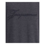 The Jacquemus crew-neck Sweater, crafted from off-white merino wool, reflects effortless elegance. Overlock stitching beneath the neckline introduces a contemporary touch, while ribbed edges subtly define the relaxed silhouette. At the back, the embroidered logo stands as a discreet yet iconic detail, elevating this timeless essential into a refined statement piece.