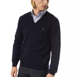 Indulge in the sartorial elegance of ‘Uominitaliani’ with this exquisite Embroidered V-neck Sweater, exquisitely crafted from extrafine Merino Wool. This Italian creation boasts a flattering V-neck cut and intricate embroidery, offering an unmatched blend of style and comfort. Its deep blue hue adds a touch of bold sophistication to any gentleman’s wardrobe.